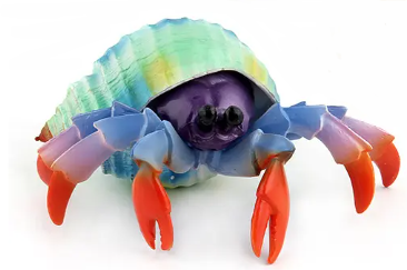 Simulated, realistic hermit crab rubber toy figurine in rainbow colors